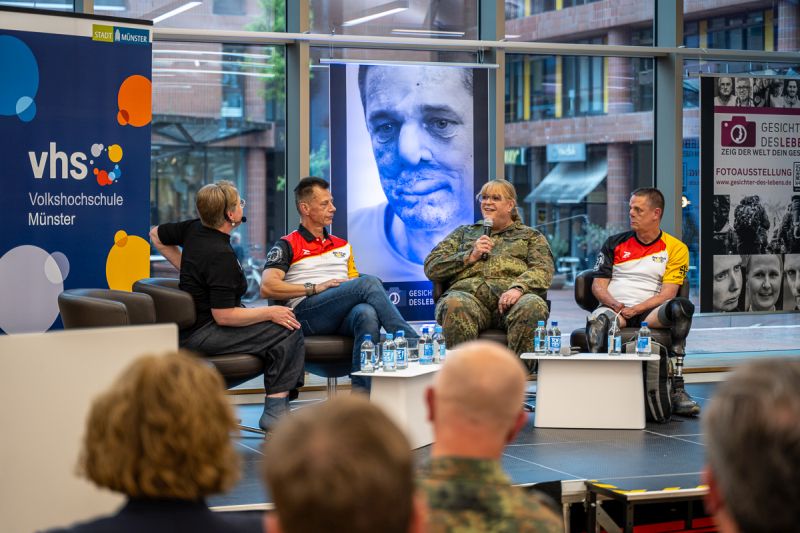 Als Kooperationspartner wirken das 1. Deutsch-Niederländische Corps, das Friedensbüro Münster und der Volksbund Deutsche Kriegsgräberfürsorge mit. Die Schirmherrschaft zu dem Ausstellungsprojekt ‘Gesichter des Lebens’ hat Oberbürgermeister Markus Lewe gemeinsam mit dem Standortältesten der Bundeswehr von Münster, Brigadegeneral Jens Arlt, übernommen, der an diesem Abend ganz besonders die Teammitglieder der Deutschen Mannschaft bei den Invictus Games begrüßte: ‘Aki, Thomas, Armin, schön, euch zu sehen.’ Jeder habe etwas ganz Besonderes erlebt, die Ausstellung macht sichtbar, was dahintersteckt. Bürgermeisterin Angela Stähler überbrachte Grüße der Stadt Münster und betonte die enge Verbundenheit mit den Soldatinnen und Soldaten am Standort in Münster.